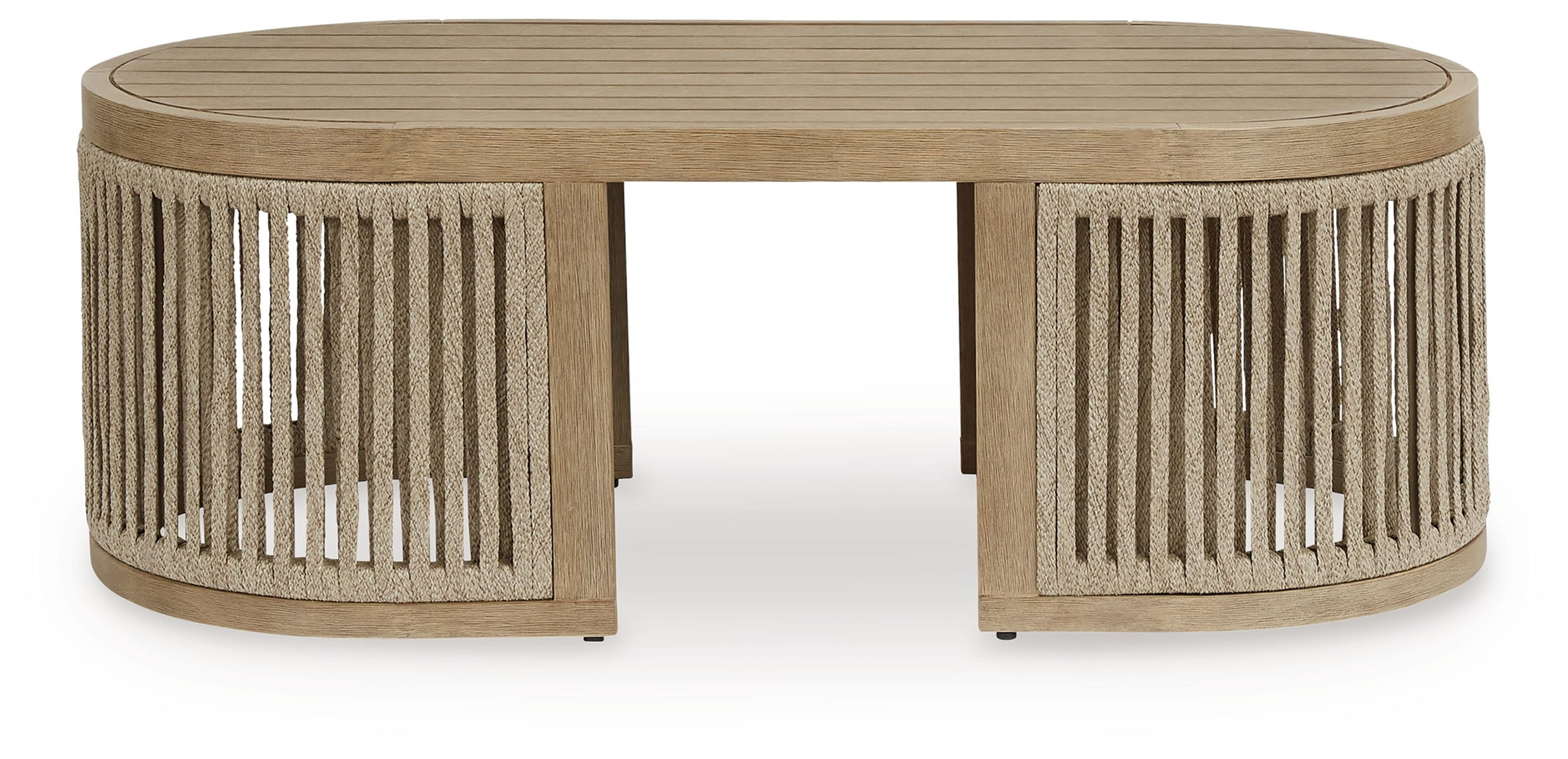Round out your outdoor living space with the naturally beautiful look of wood. This coffee table will serve up seasons of relaxation on your back deck or sitting pretty by the pool. A gently curved open-weave design, crafted from eucalyptus wood and polyester rope, is the perfect merger of high fashion and lasting durability. It’s just the spot for sips and snacks.