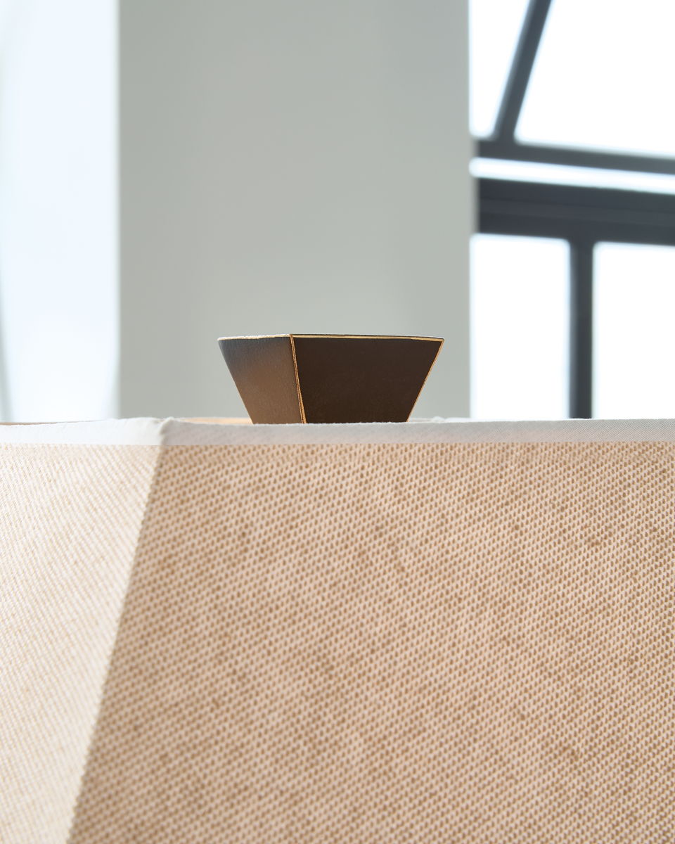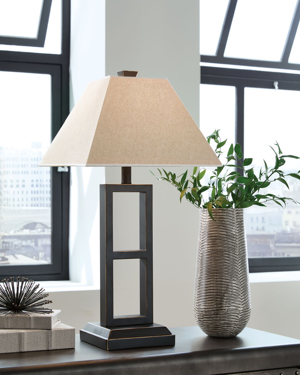 Open-ended style. This table lamp offers a strong linear design, with a rustic metal base softened by the textural waves of a chic linen-look shade. We love how the center cutouts keep these table lamps so light and airy.