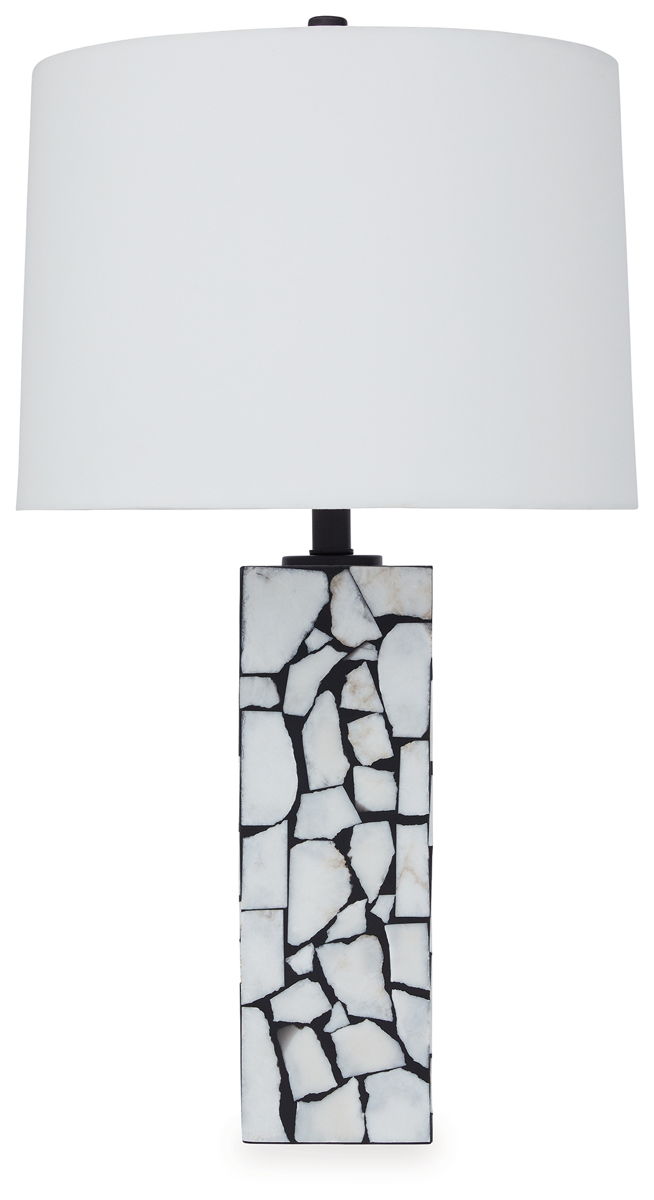 This exquisite table lamp is artfully adorned, with a mosaic pattern of white marble playing beautifully against a black background. Complemented by a modified drum shade for a sophisticated sensibility, the lamp casts an elegant glow in the entryway or living area.