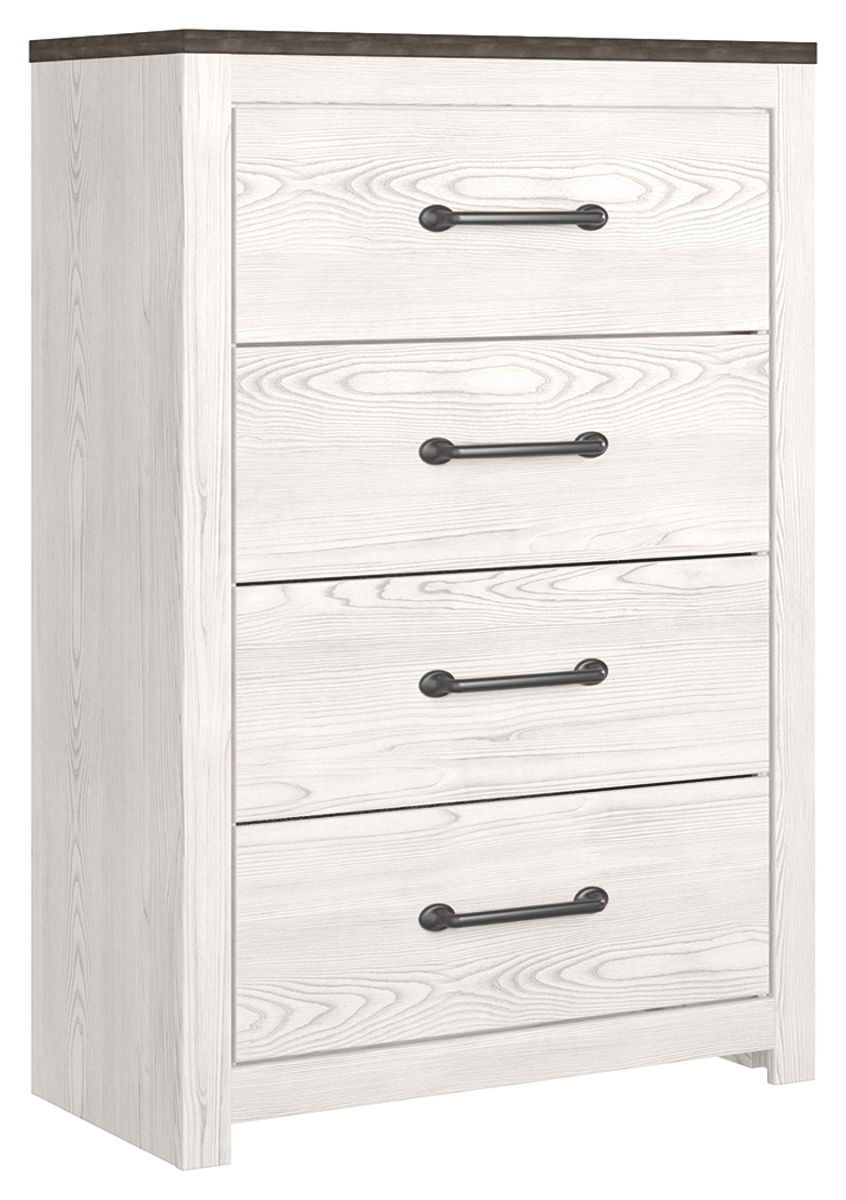 White rustic finish with replicated cedar grain accented with rustic gray planked replicated oak grain with authentic touch. Cases feature a framed front and pilasters. Contemporary handles in a dark pewter color finish. Side roller glides for smooth operating drawers. Drawer interiors lined with a replicated linen design for a clean, finished look.