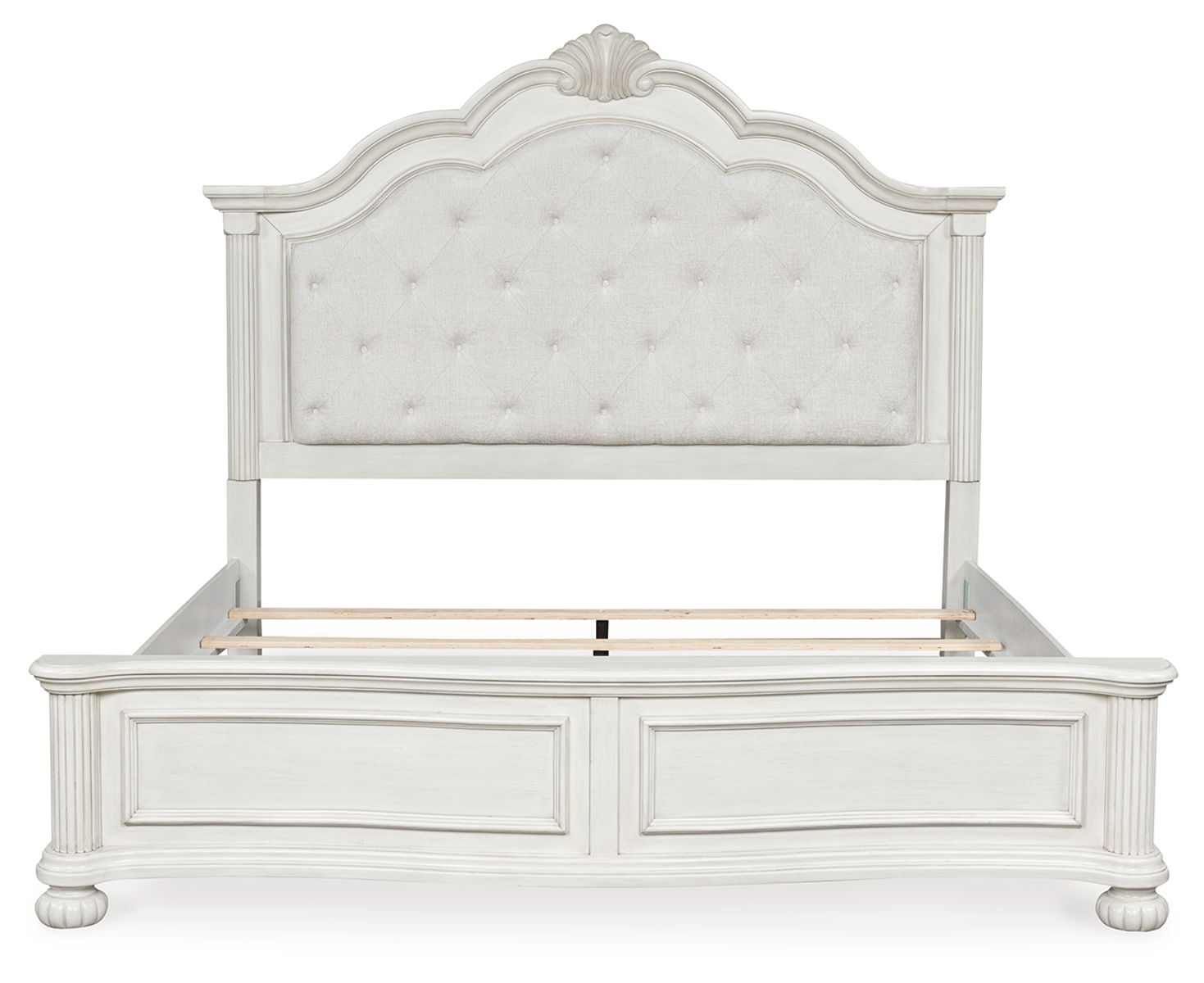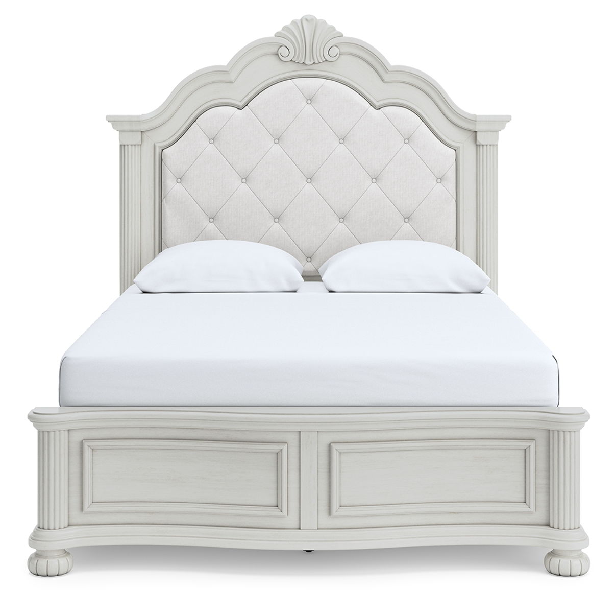 Transform your inner sanctum into a haven of timeless elegance. This traditionally inspired upholstered panel bed features a cushioned headboard embellished with a serpentine-shaped crown and light pearl gray upholstery. A contoured footboard with picture frame moulding completes the ageless aesthetic. And did we mention the classic antiqued white finish and stylish reeded bun feet? Talk about relaxed refinement.