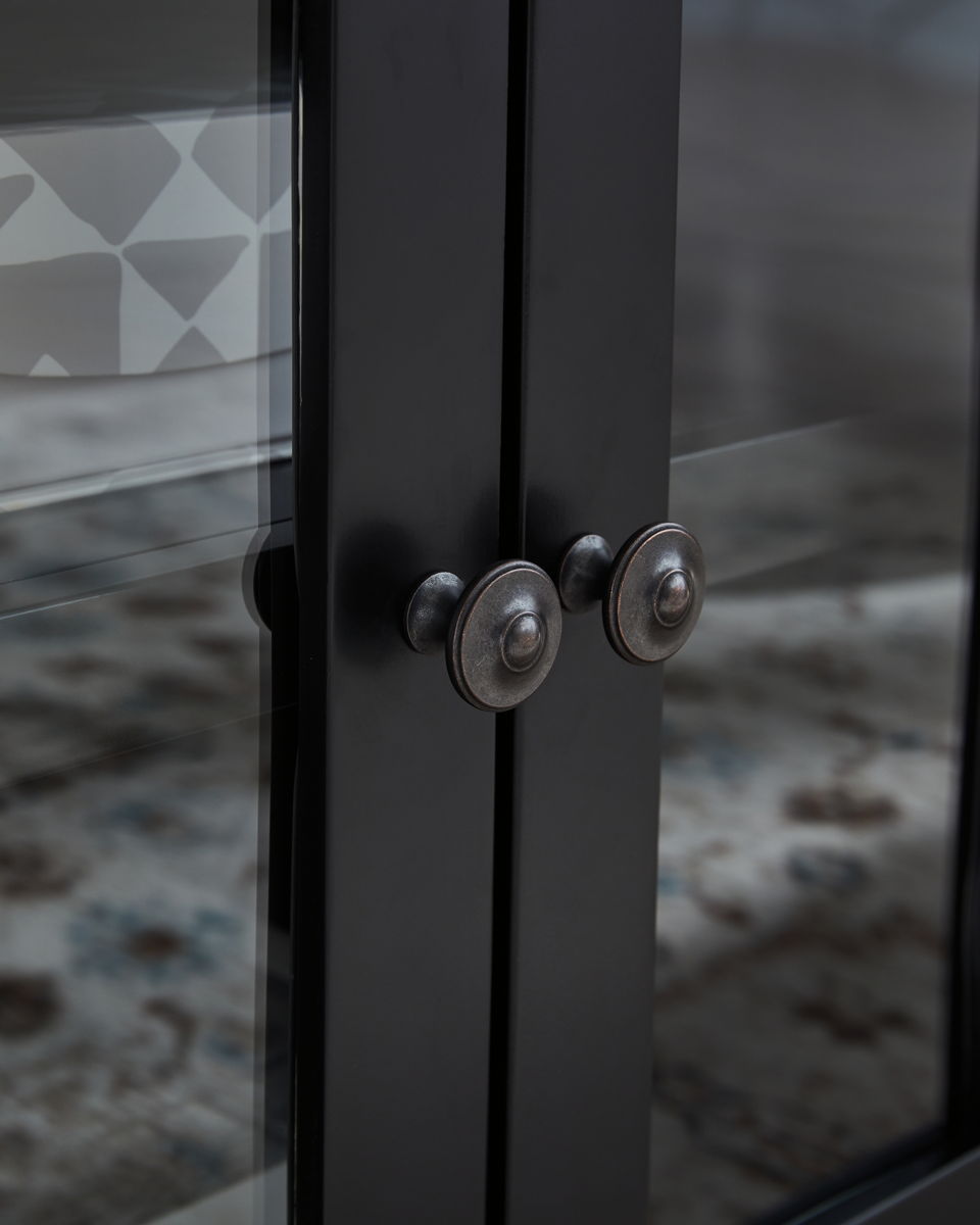 Raise the bar on modern farmhouse style with this TV stand with electric fireplace. Its sturdy silhouette and casual good looks are accentuated with a two-tone finish, which pairs a warm satin black base with a contrasting butcher block veneer top. Glass door cabinets with adjustable shelves offer plenty of storage for media and electronics. Adding that much more show-stopping style, the electric fireplace insert operates with or without heat and includes a six-level temperature setting, a remote control and an overheating control for added safety. It comes with faux glass crystals and natural stones, so you can customize the look of the flame bed.