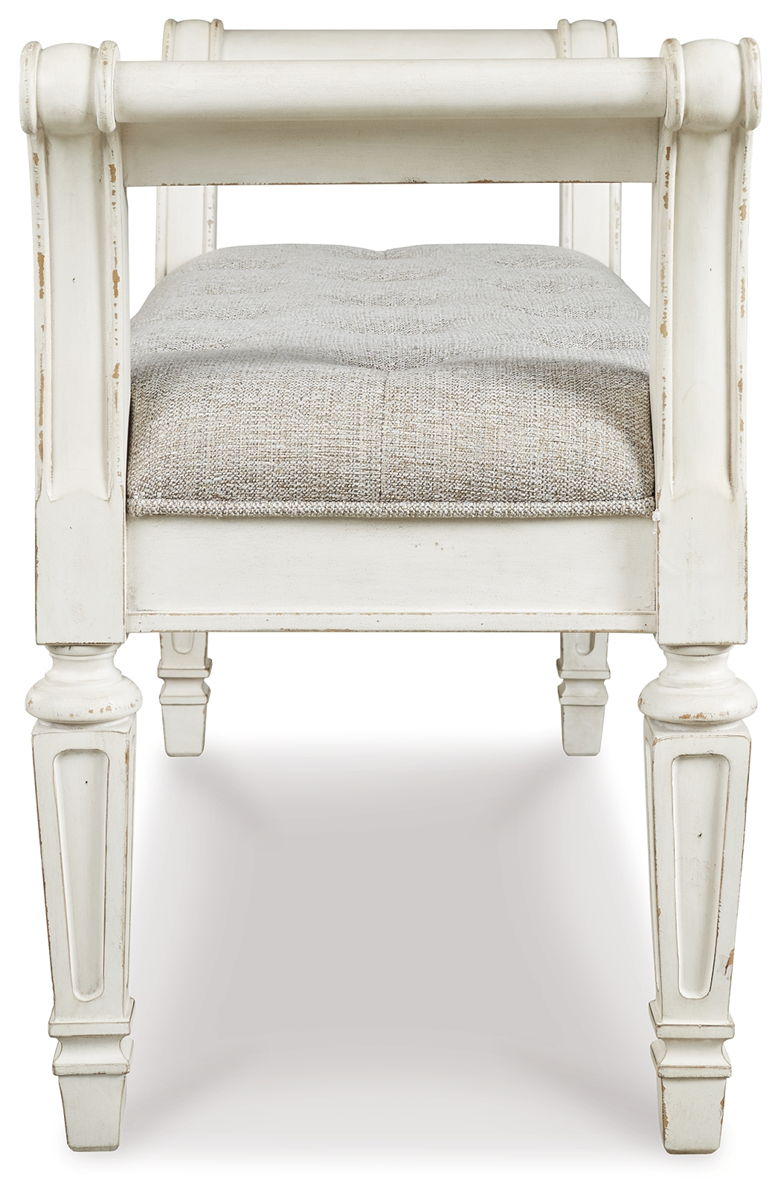A classic to be cherished for years. This accent bench is a timeless treasure. Quality wood frame flaunts an antiqued white finish. Touches like the scrolled arms and floral applique give this piece so much character. You’ll love sitting on the cushiony, tufted seat in all of its sophistication.