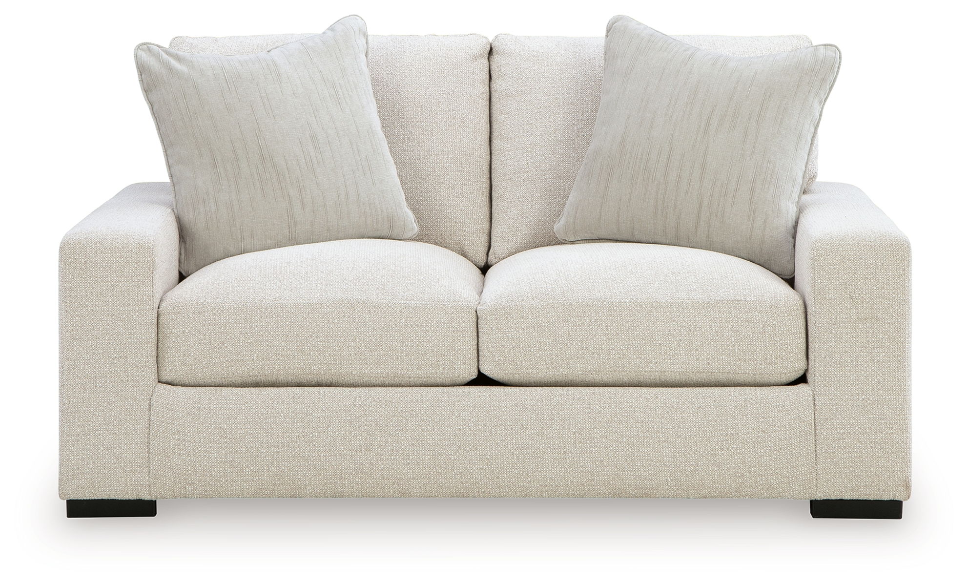 A triumph in transitional design, this loveseat invites you to indulge in complete comfort. The contemporary yet classically styled piece is covered in oh-so-soft boucle upholstery for a sense of stately sophistication. Decorative velvet pillows in muted hues complete the vibe.